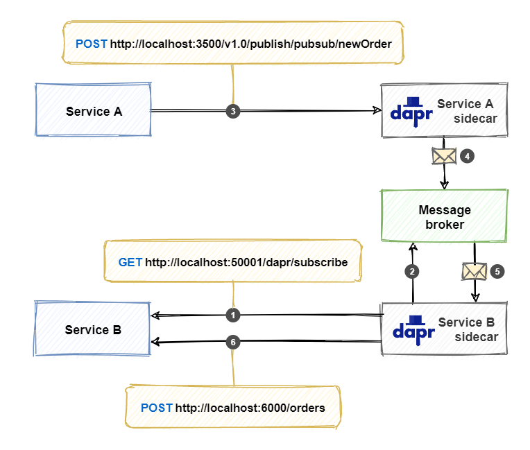Service B sidecar作为消费从Service B调用接口/dapr/subscribe,服务会帮它创建相关订阅;Service B sidecar在消息中间件上创建订阅;Service A向Service A sidecar的接口/v1.0/publish/<pub-sub-name>/<topic>上发布一条消息;Service A sidecar将消息发布到消息中间件;- 消息中间件将消息副本发送给