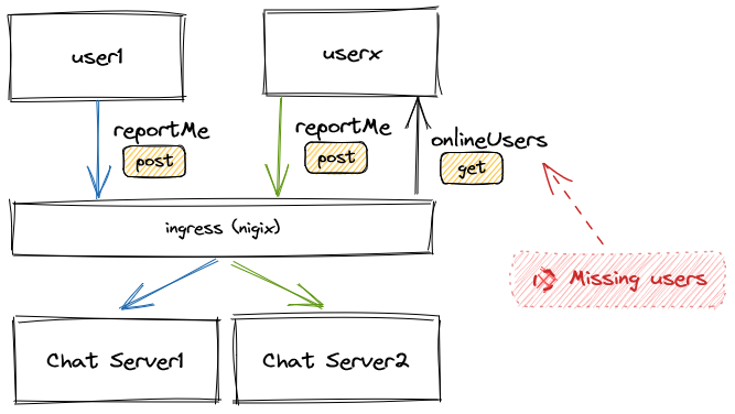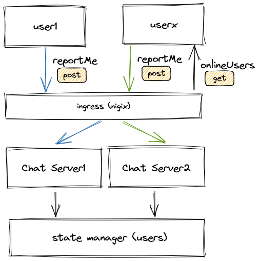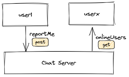 拿聊天场景来举例,最初,我们有一个聊天服务器,用户通过接口reportme上报自己的状态,通过接口onlineUsers来获得全部的在线用户,如下图: